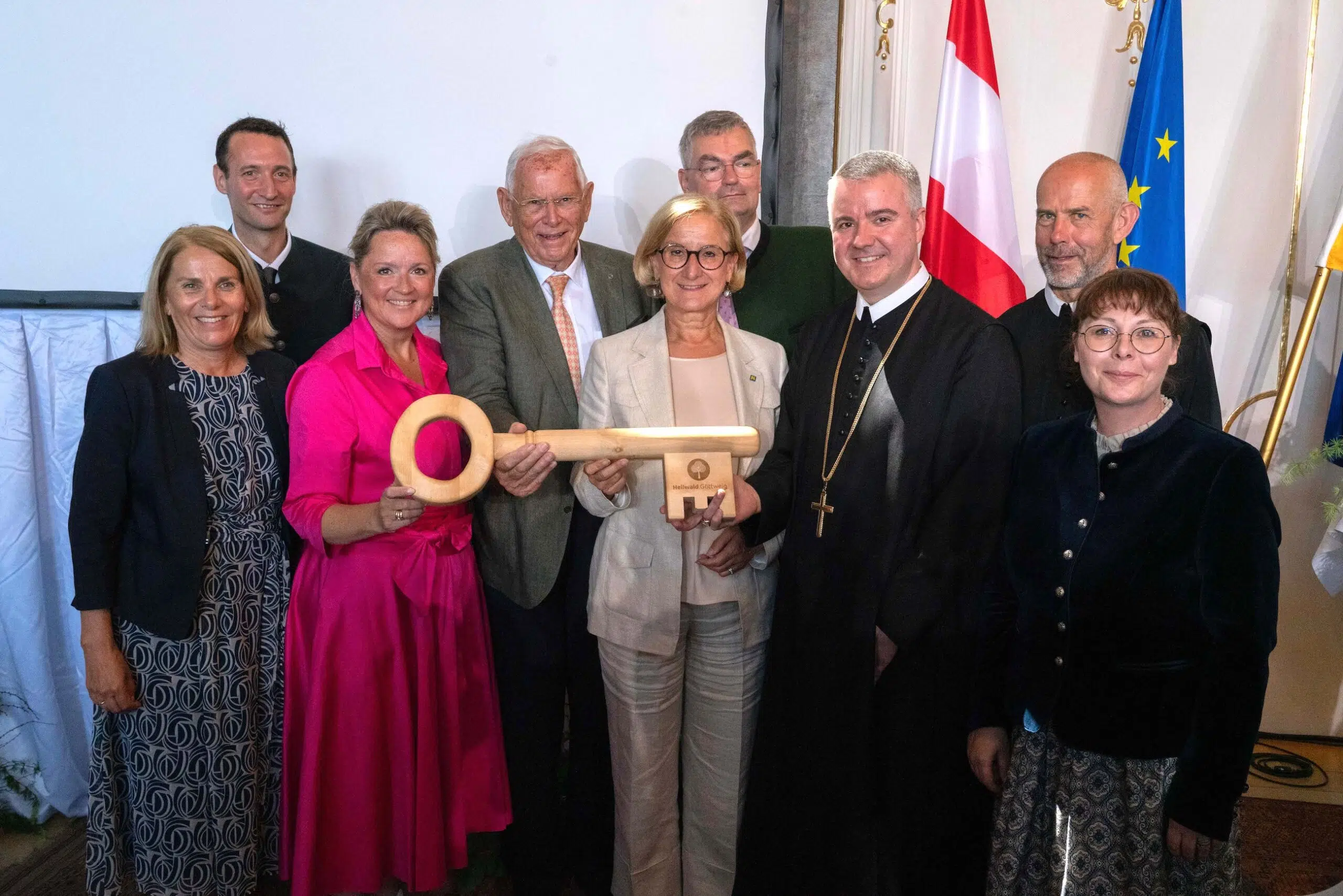 V.l.n.r.: IMC-Geschäftsführerin Ulrike Prommer, IMC-Geschäftsführer Udo Brändle, Landesrätin Susanne Rosenkranz, IMC-Aufsichtsratsvorsitzender und Projektinitiator Heinz Boyer, Landeshauptfrau Johanna Mikl-Leitner, Wirtschaftsdirektor Stift Göttweig Gerhard Grabner, Abt Patrick Schöder, Pater Maurus Kocher und IMC-Projektleiterin des Heilwalds Göttweig Susanne Bauer.