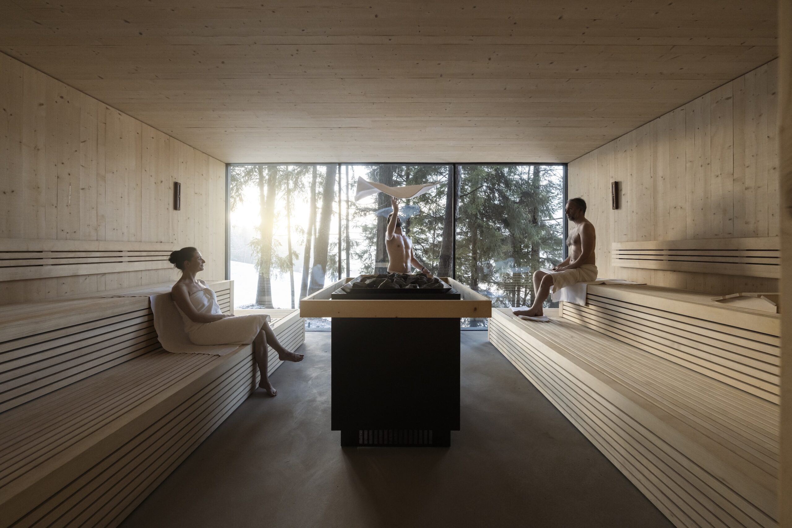 Das AKI Family Resort PLOSE interpretiert Wellness aus einer familiären Perspektive. Panoramasaunen und großzügige Ruhebereiche schaffen Raum für gemeinsame Entspannung – ohne dabei auf Design und landschaftliche Integration zu verzichten. Der Blick fällt auch hier auf die Dolomiten.