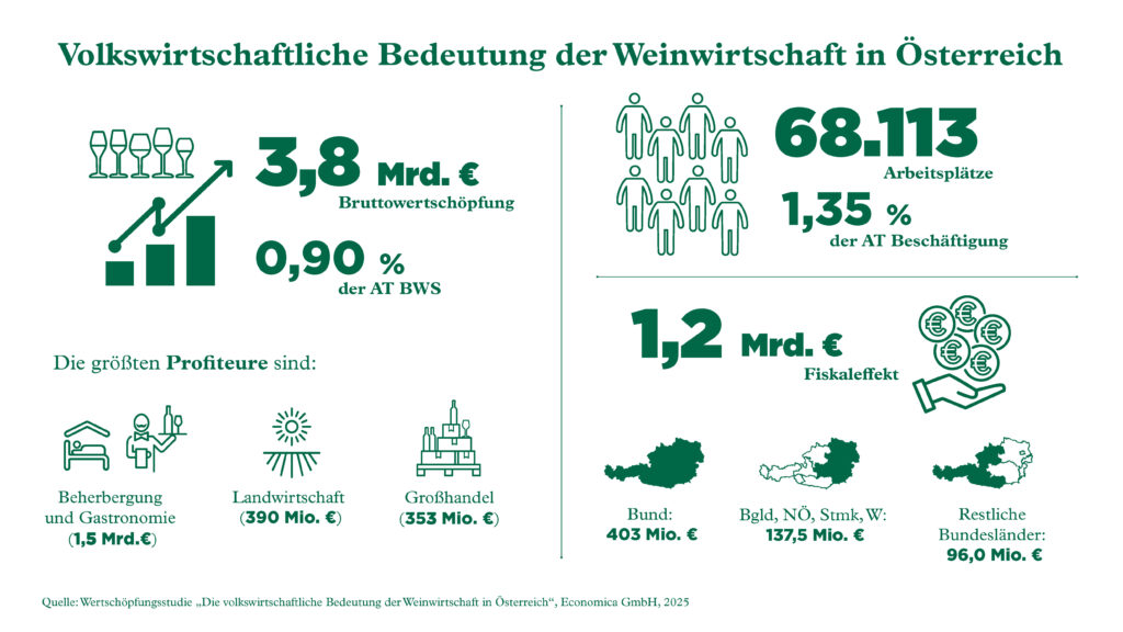Wein ist in Österreich nicht nur Genuss, sondern Wirtschaftskraft. Laut einer aktuellen Studie der Economica GmbH im Auftrag der Österreich Wein Marketing GmbH (ÖWM) trägt die heimische Weinwirtschaft jährlich 3,8 Milliarden Euro zur Bruttowertschöpfung bei und sichert über 68.000 Arbeitsplätze. Damit gehört sie zu den tragenden Säulen der ländlichen Wirtschaft – und ist zugleich ein wichtiger Motor des Inlandstourismus.